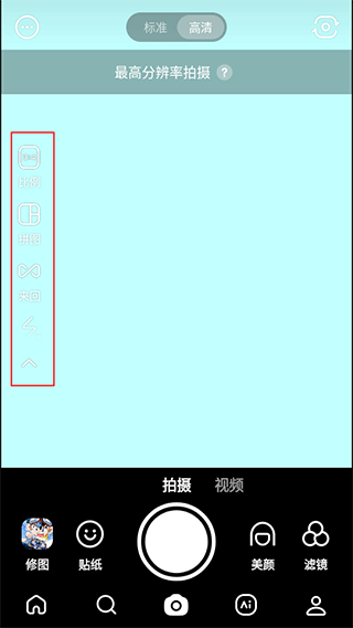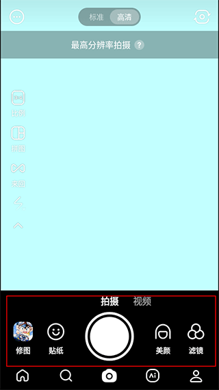 1、下方菜单栏可以切换拍摄或视频功能,可以在照片和视频上直接添加贴纸,进行美颜和切换不同的滤镜
