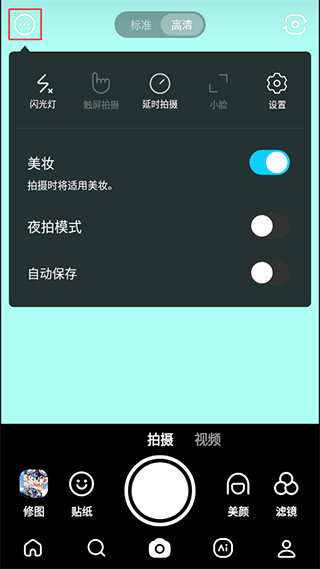 3、点击上方的三点标志,可以对拍照进行更精准的设置,例如美妆功能,夜拍模式,自动保存,延时拍摄等等