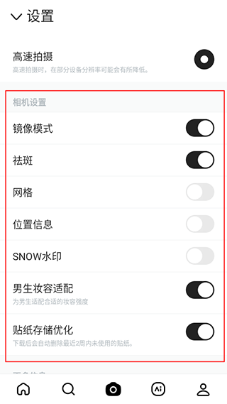 4、在设置界面,可以关闭位置信息,水印等不常用功能,开启祛斑、网格、男生妆容适配等常用功能