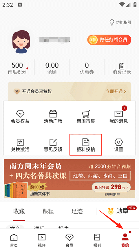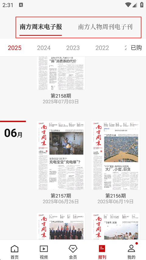 1、打开南方周末App,点击报刊功能页,在下方随意选择一篇电子报进入;