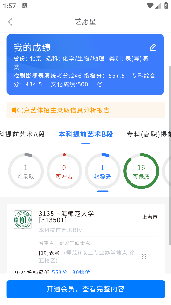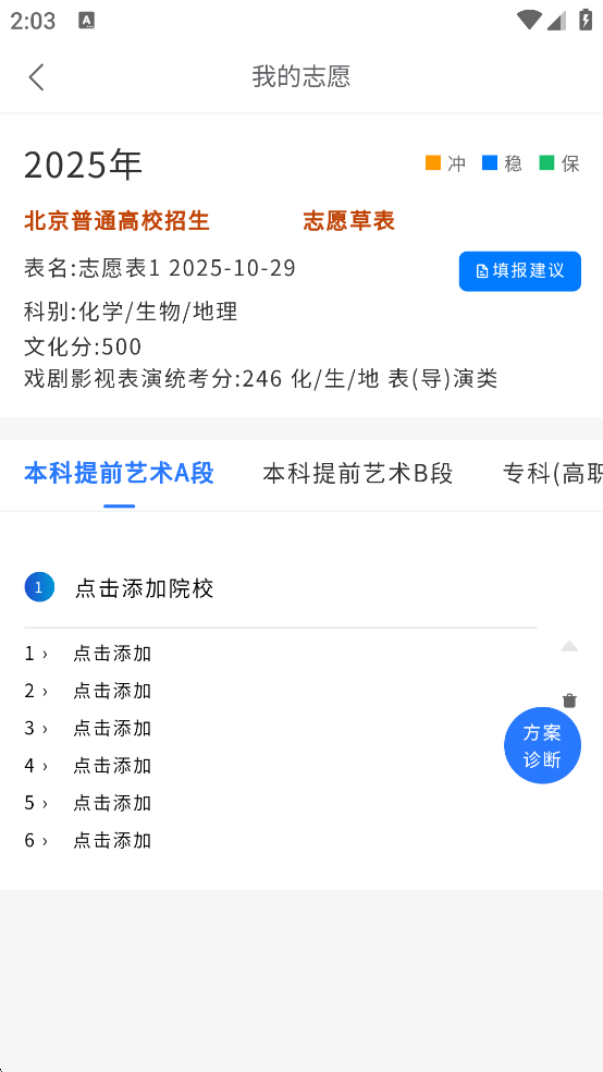 3. 支持依据艺考成绩智能筛选院校专业,快速生成冲刺、稳妥、保底志愿推荐。