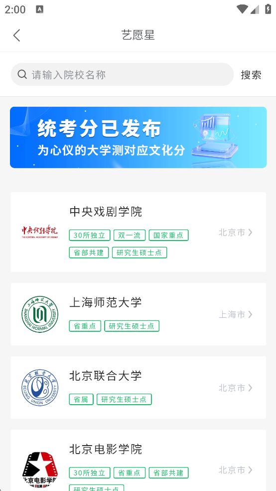 艺愿星这款软件包含了许多艺考类型的教学材料,同时帮助广大用户们推荐更棒更为合适的志愿学校,历年的报考数据和专业筛选都可以为你解决更多的后顾之忧,文化成绩以及统考算法都有最专业的数据师帮助你分析,是很多正在准备艺考的学子们最佳选择,不收费无广告让你用的更加舒畅,有需要的小伙伴们快来下载艺愿星试试吧,和更多的艺术学校都有合作,让你一键查询相应分数哦。